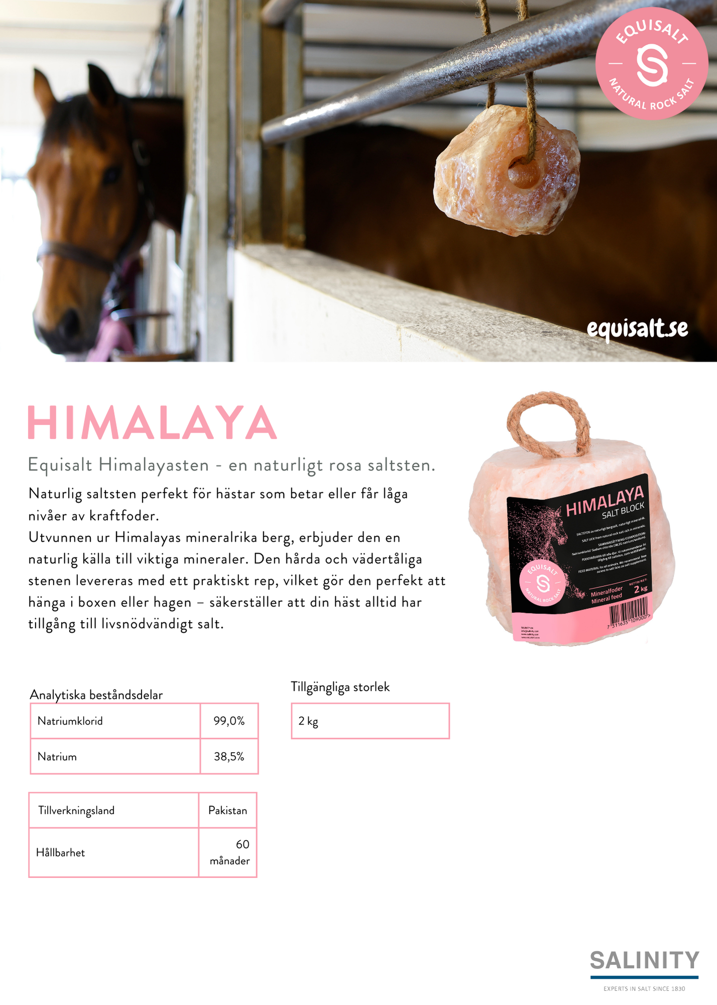 Equisalt Himalaya är en helt naturlig saltsten som bryts ur Himalayas berg. Den har sin karaktäristiska rosa färg från mineralerna i berget och är ett uppskattat tillskott för hästar i alla miljöer. Saltstenen kommer med ett praktiskt snöre som gör den enkel att hänga upp i boxen, hagen eller ta med på tävling.